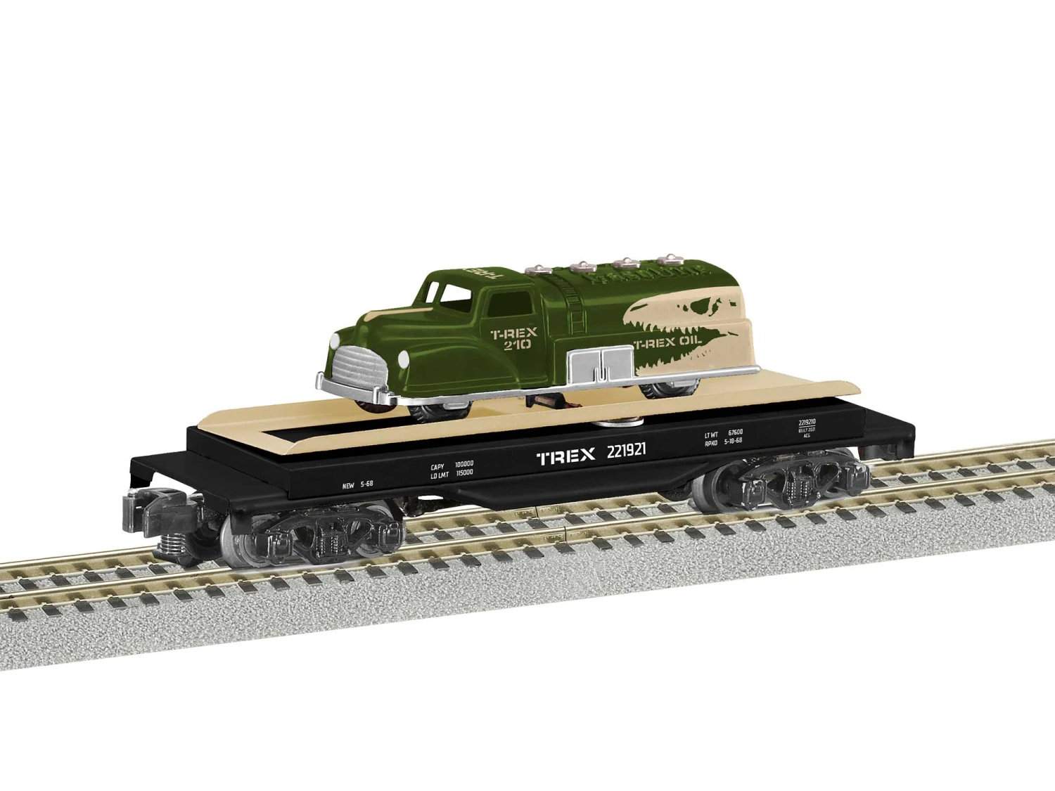 Your T-Rex oil delivery will be on the road in a hurry with the operating ramp car. The car will offload the truck to the side of the track when used with an American Flyer operating track (sold separately). It’s the perfectcomplement to your T-Rex Oil yard.